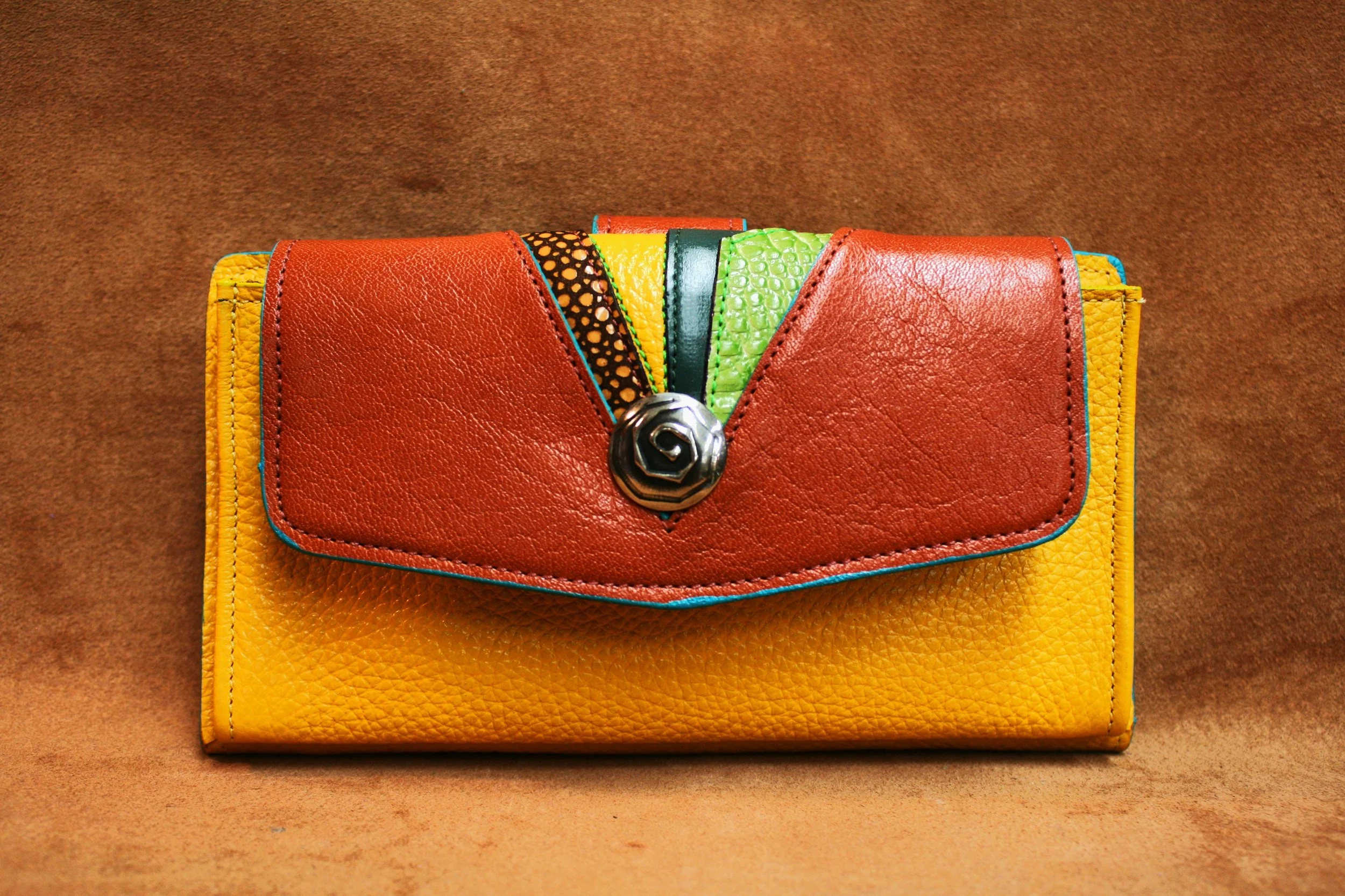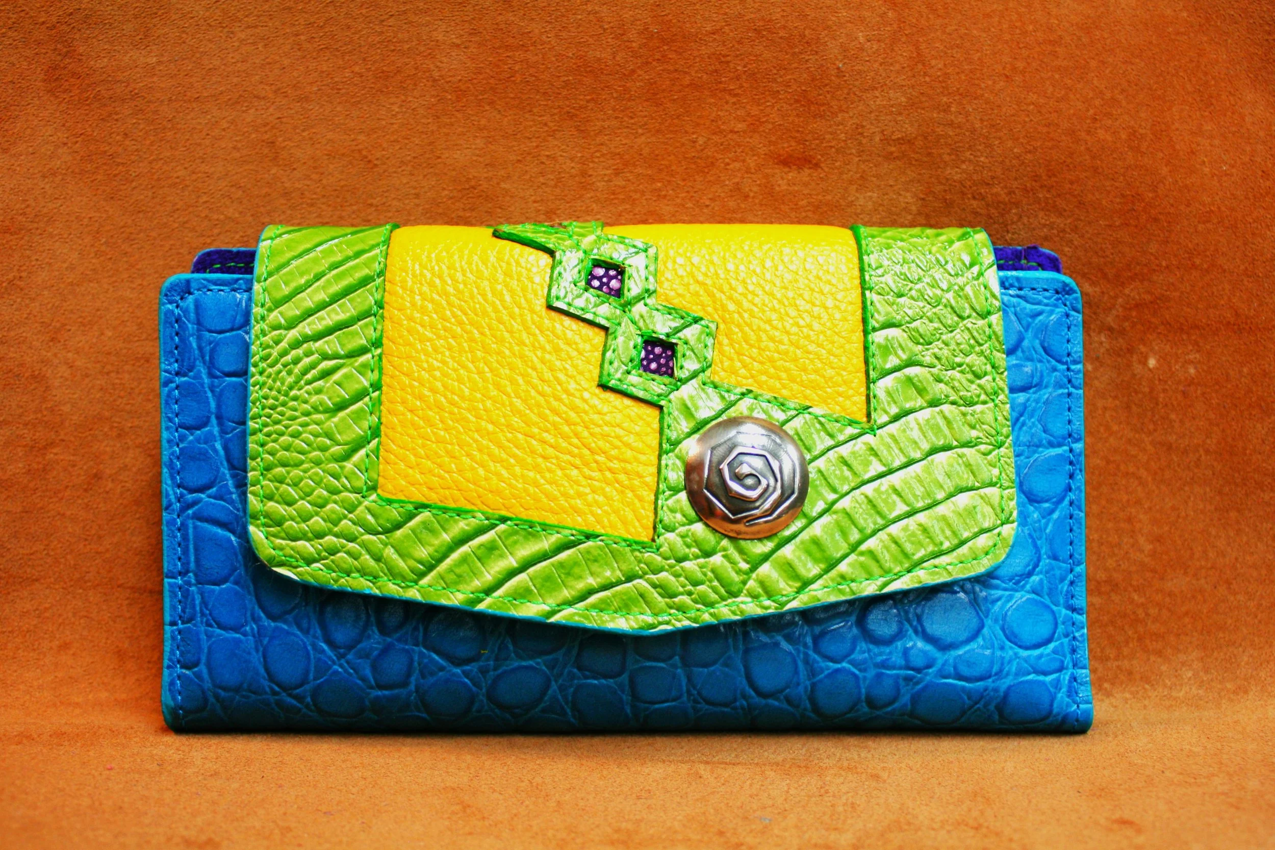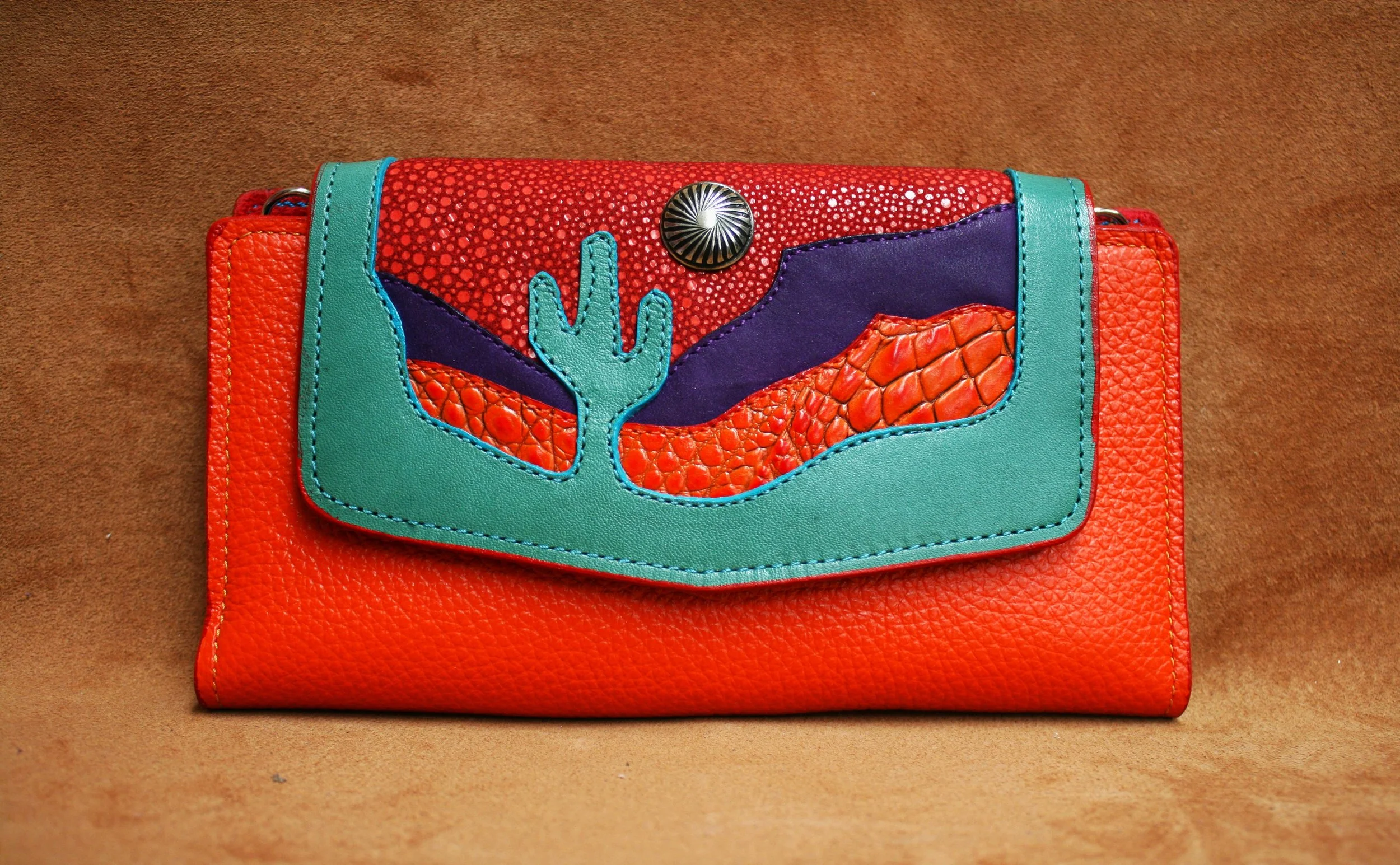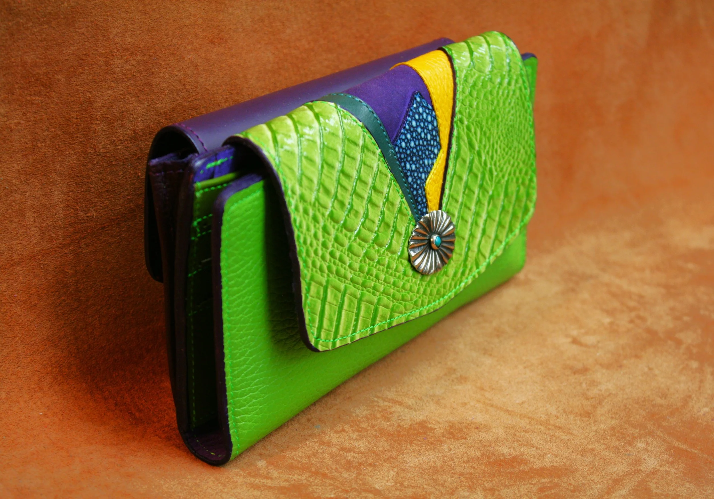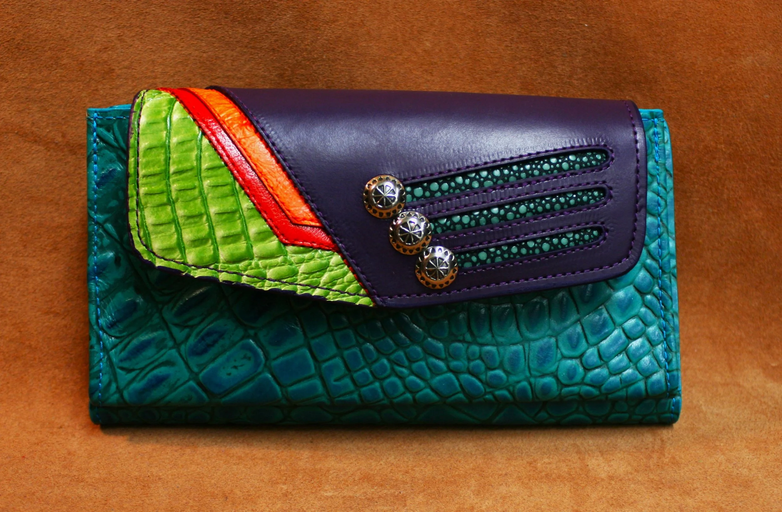 Triple Triangles - Orange embossed alligator with turquoise calf flap, lime, cognac & magenta stingrey accents. Nickel silver concho