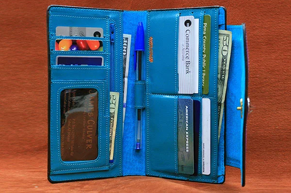 A slim profile credit card wallet. The inside has a pen holder, 9 card slots capable of holding multiple cards, a view/id card window, cash and zipper pockets. On the reverse side is your choice of a zip coin pocket (#1) or a phone pocket (#2). A detachable spaghetti strap is included if you would like to wear this as a small handbag. The size is approx. 7 1/2" x 4" closed.