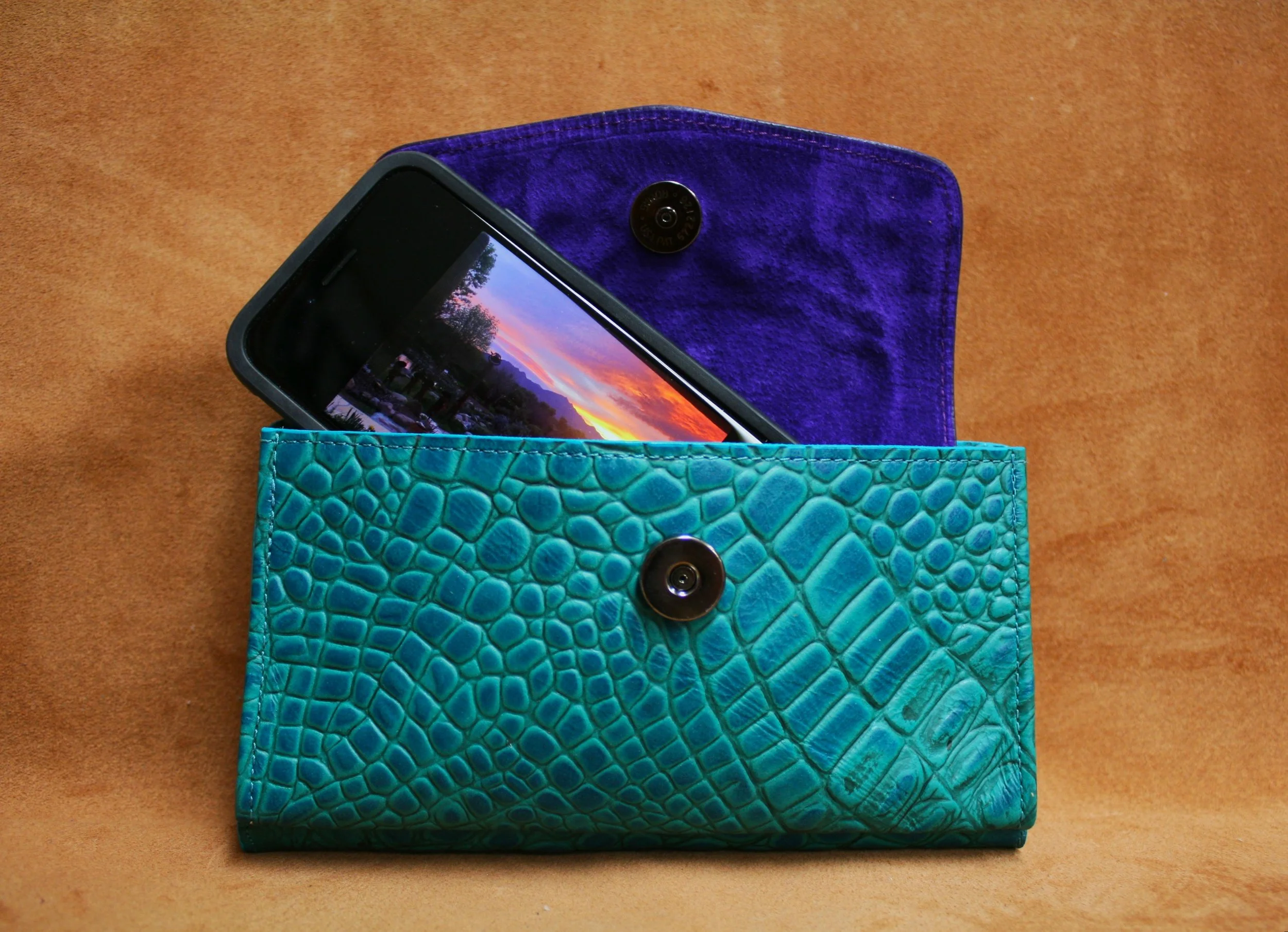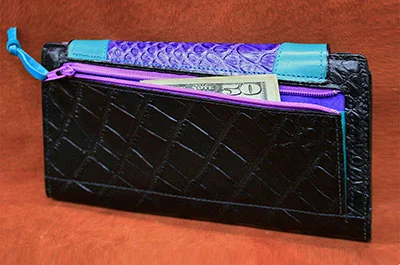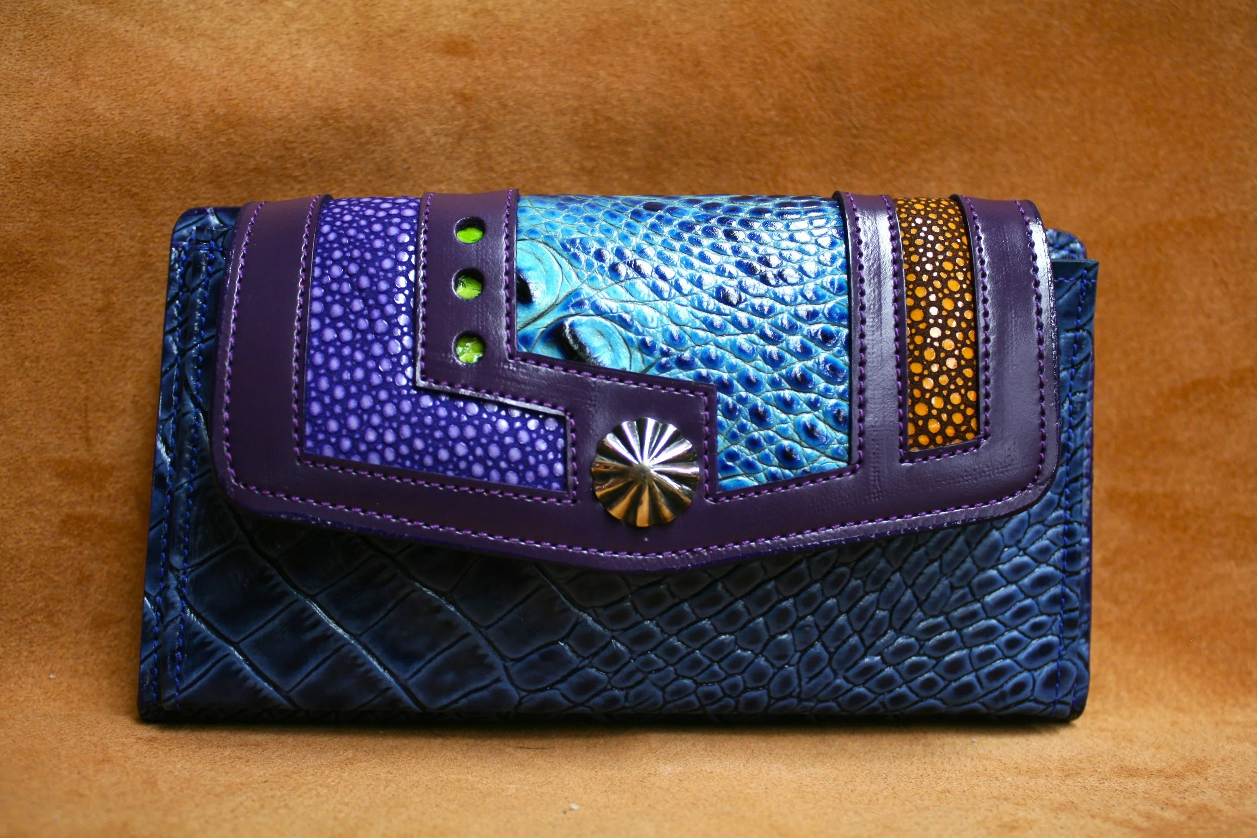 Sunrise - Teal embossed alligator with purple calf flap, red with turquoise stingrey inlays. Nickel silver concho