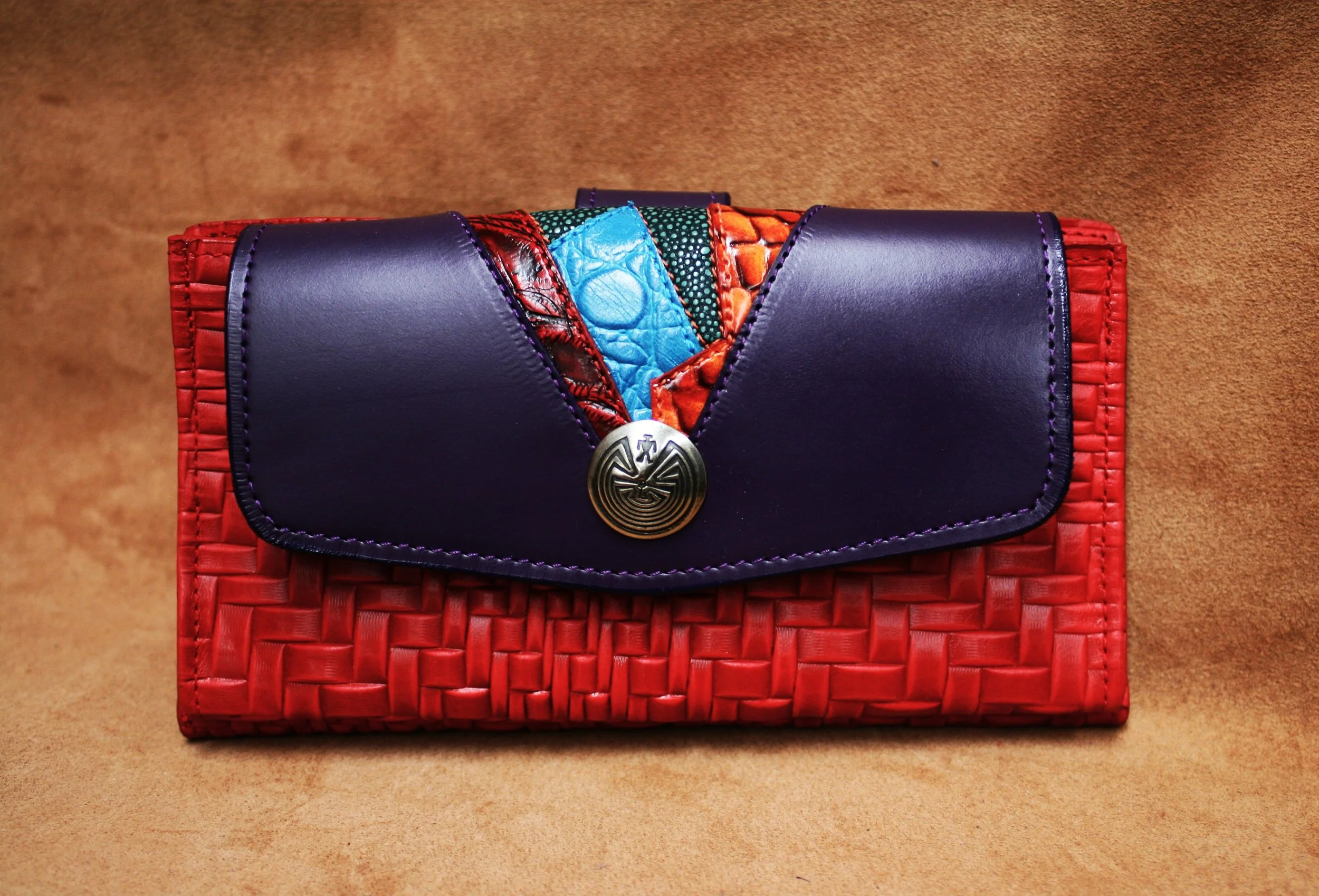 CityScape - Red embossed woven calf with purple calf flap, multicolor inlays. Nickel silver concho