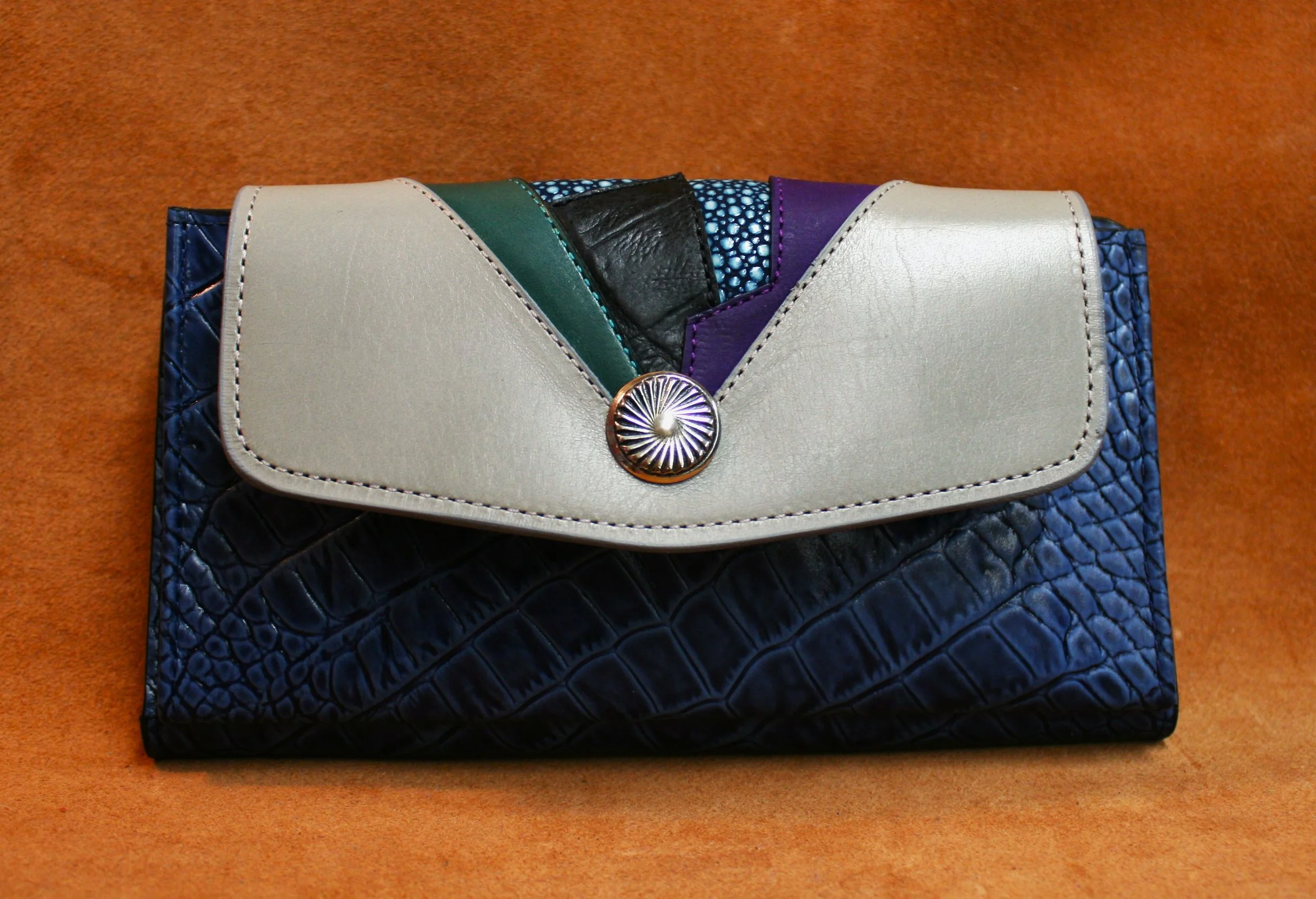 CityScape - Denim embossed alligator with grey calf flap,turquoise,purple, black & denim stingray accents. Nickel silver concho