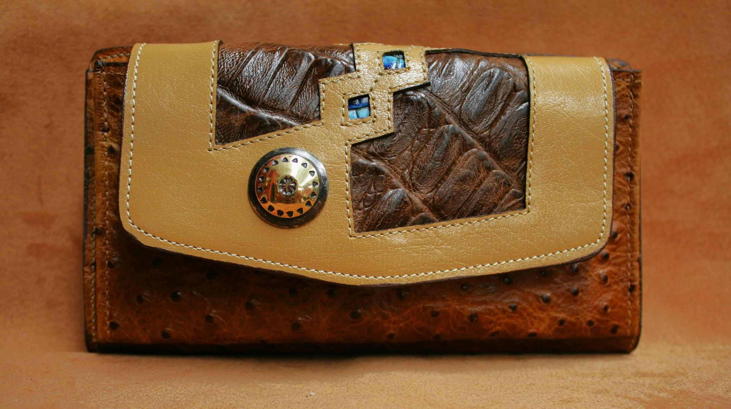 Rattler - Camel embossed ostrich with amber calf flap, cinnamon & turquoise inlays. Brass over nickel silver concho