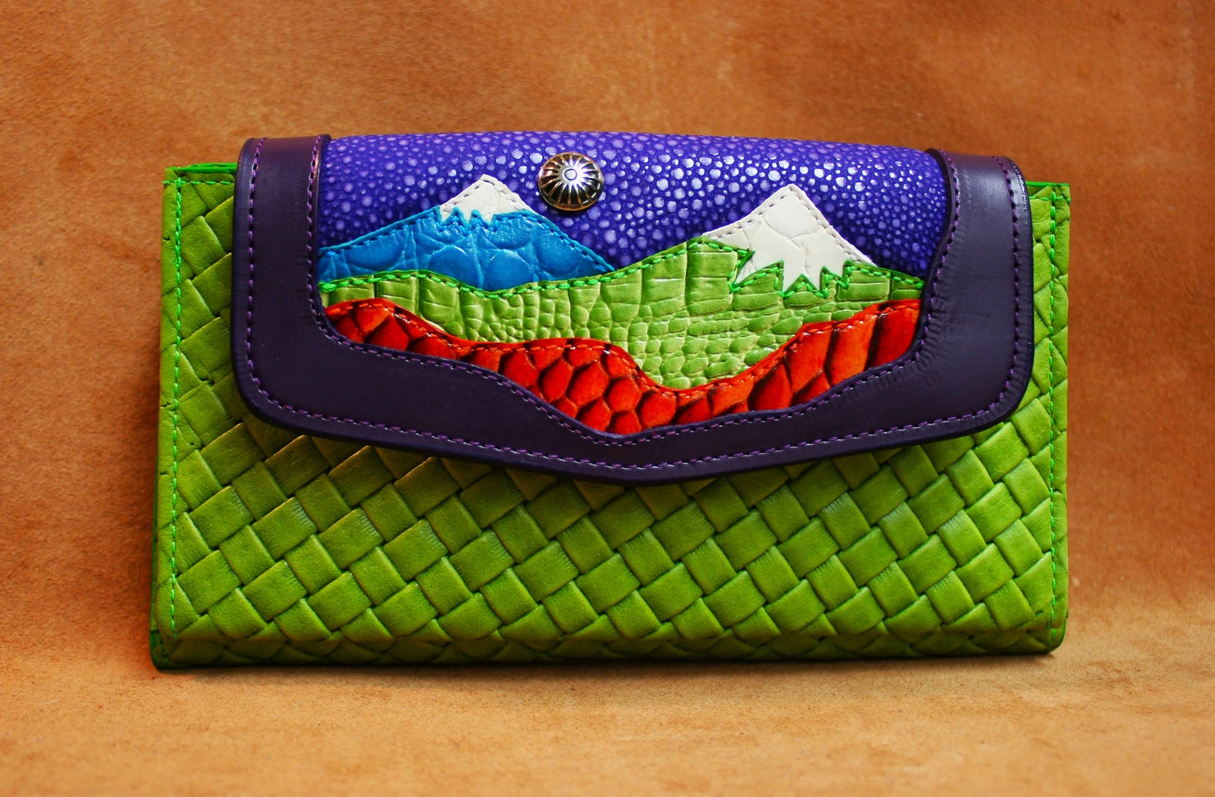 Snowy Landscape - Lime embossed woven leather with purple calf flap, cognac, lime & aqua mountains, purple stingrey sky. Nickel silver conchos
