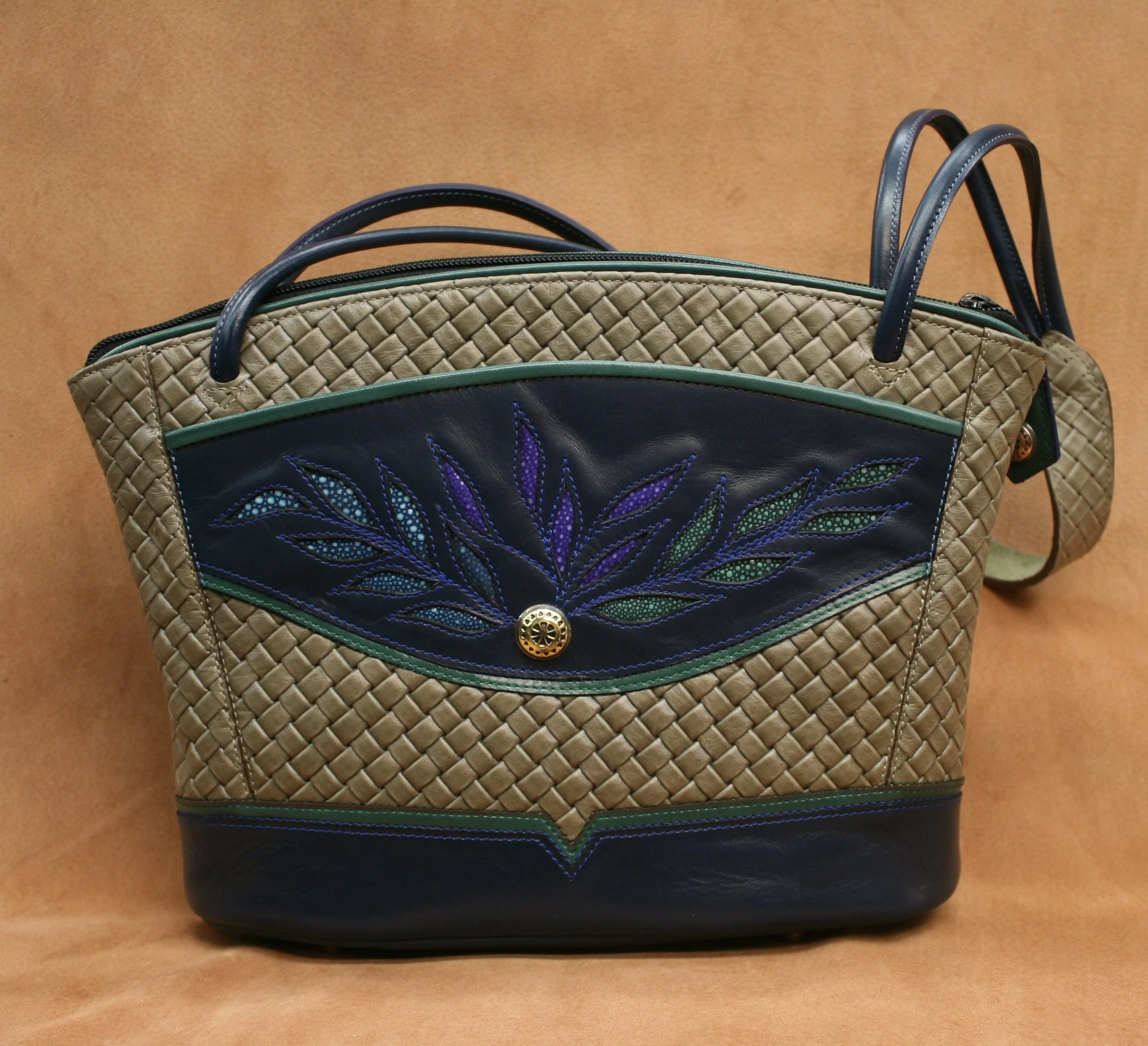 Leaves - Taupe woven embossed cow with navy calf trim, olive calf reveals & various color stingrey inlays. Bronze over nickel silver concho $425