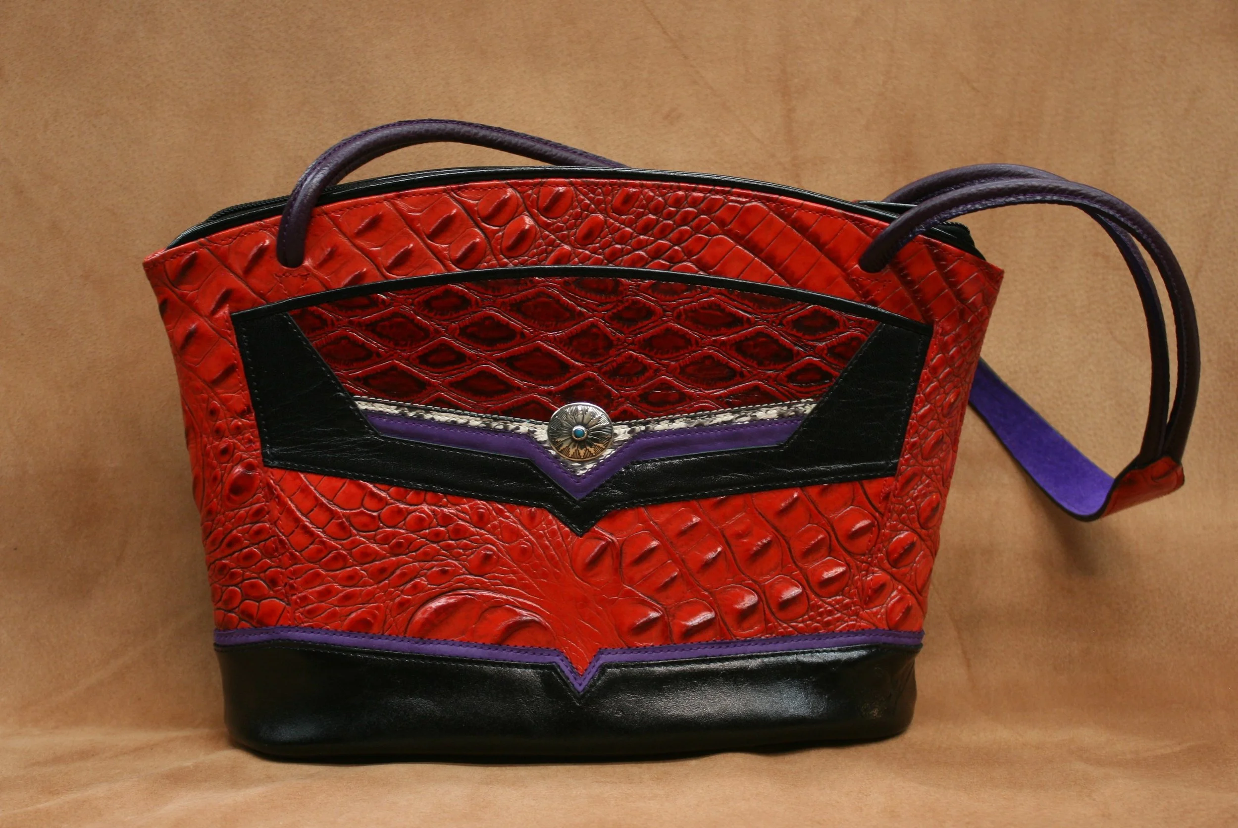 Geo Sunrise - Red faux hornback alligator with black calf trim, purple nubuck, black & white snake, red embossed cow reveals. Nickel silver concho with turquoise inlay. $425