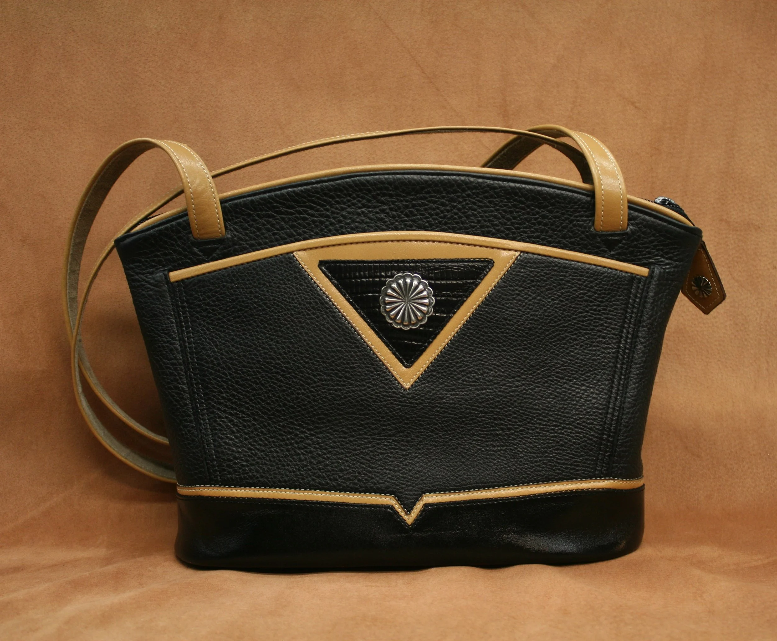 Triangles - Black pebble cowhide with amber calf trim (2 independent shoulder straps shown, available upon request). Pewter concho $425